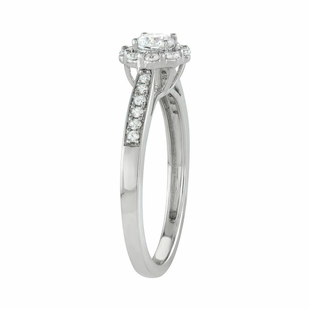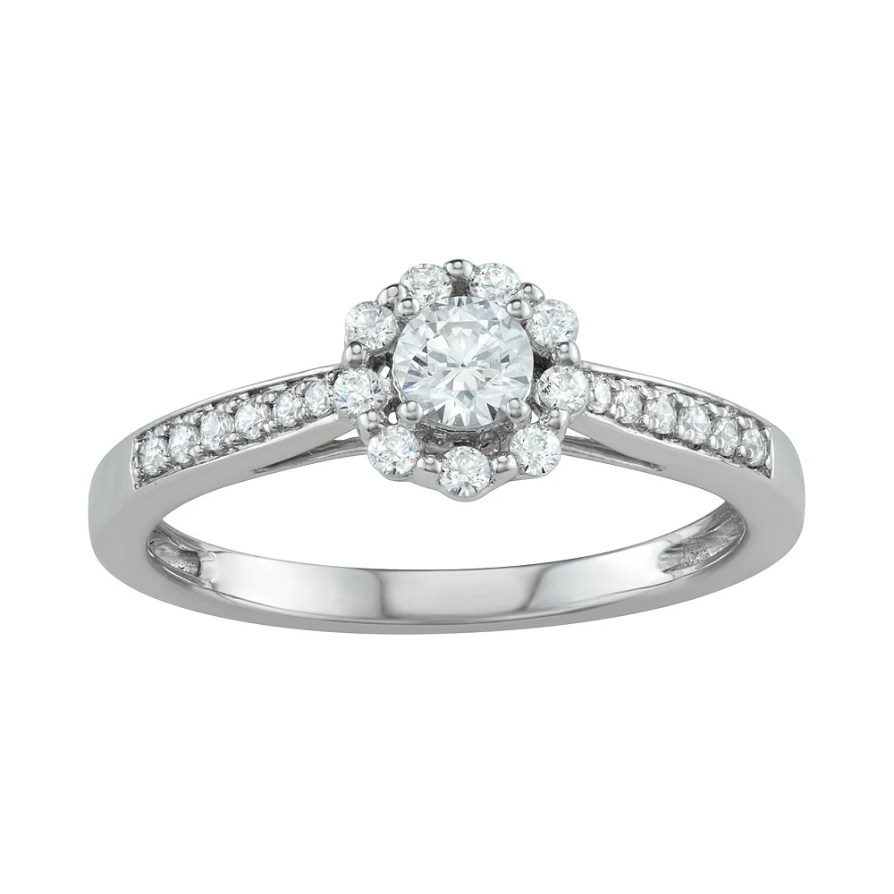 Featuring a flower motif adorned with scintillating round-cut diamonds, this Simply Vera Vera Wang engagement ring is simply lovely.