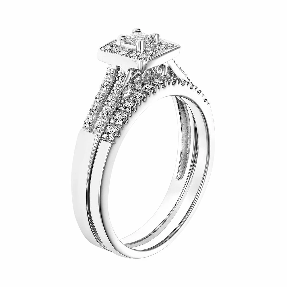 Create a lifetime of memories when you propose with this Simply Vera Vera Wang square halo engagement ring set. Decorated with a princess-cut certified diamond center stone and certified diamond accents along the bands, this 14k white gold engagement ring set beautifully displays your unending love. Packaging: signature packaging includes a wooden ring box, satiny pouch, gift box with ribbon and gift bag.