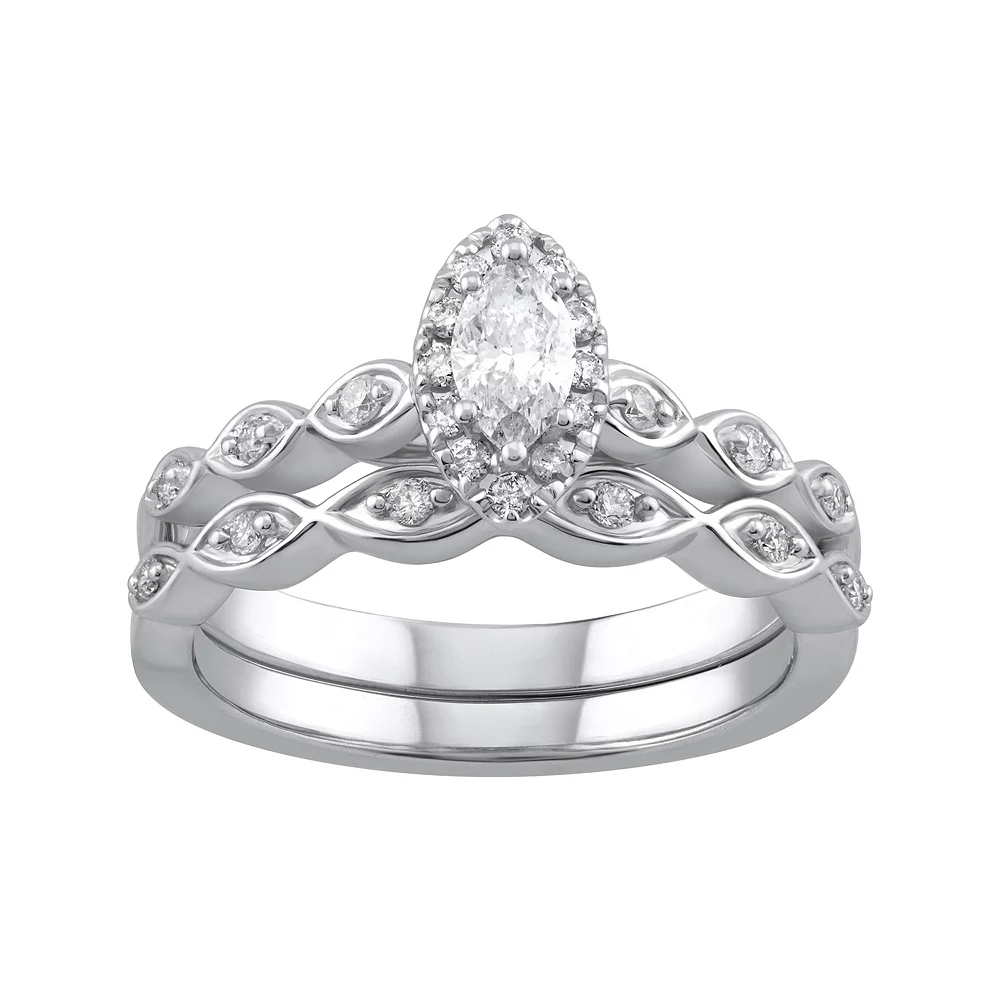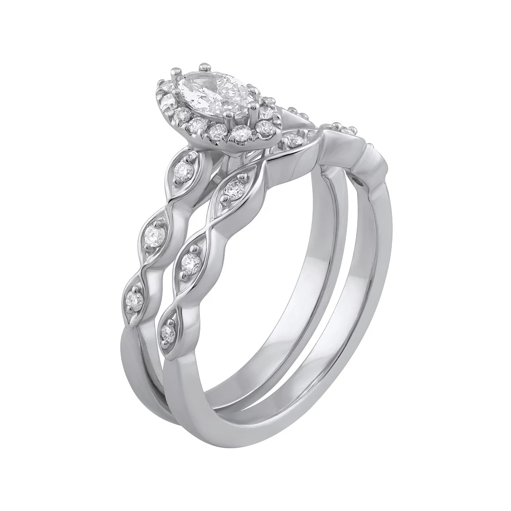 Beautifully decorated with dazzling diamonds, this 14k white gold engagement ring set is a breathtaking symbol of your commitment.