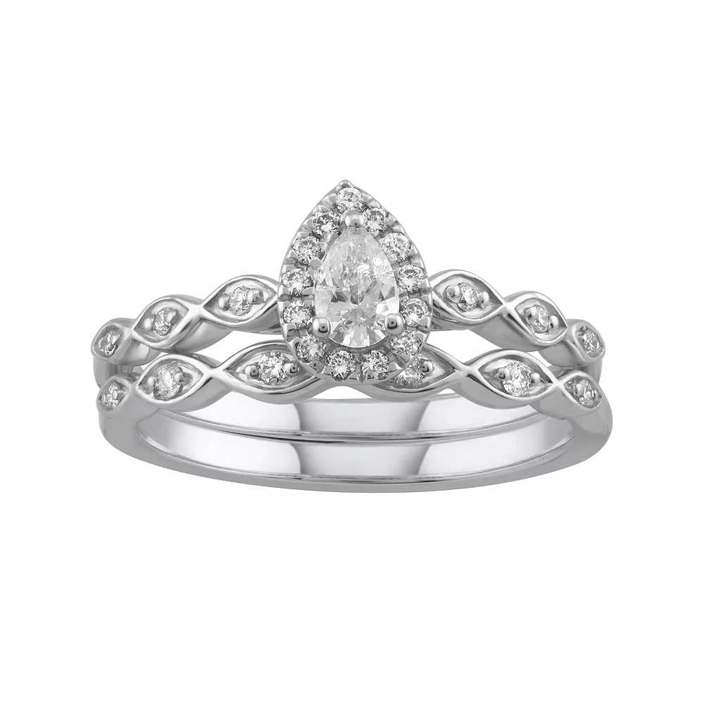Decorated with dazzling diamonds, this 14k white gold engagement ring set makes a breathtaking symbol of your love and commitment.