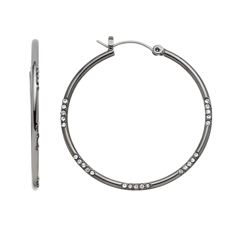 Sparkling simulated crystals highlight these jet hoop earrings for eye-catching style.