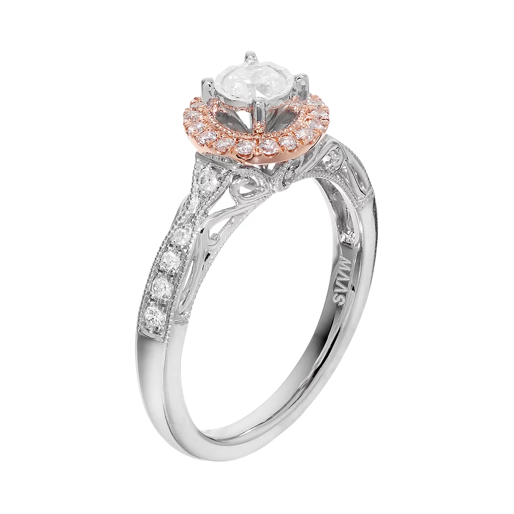 Adorned with round-cut diamonds in a tiered halo design, this two-tone Simply Vera Vera Wang engagement ring is absolutely stunning. A row of diamond accents and miligrain detailing complete this alluring ring.